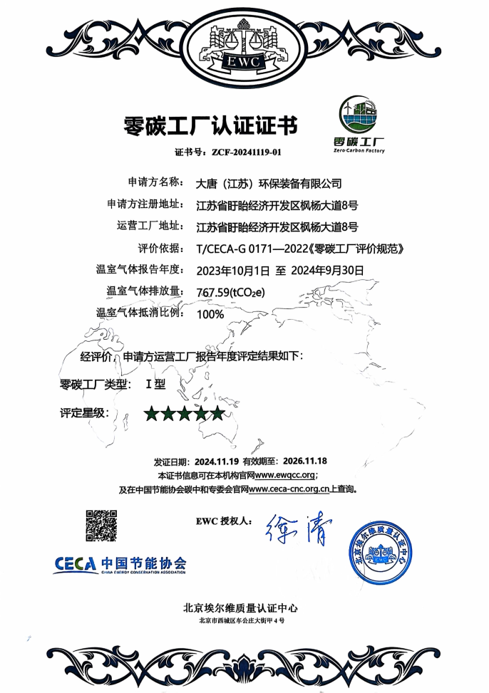 本网讯 近日,大唐(江苏)环保装备有限公司凭借其在绿色制造与可持续发展方面的卓越表现,成功获得中国节能协会颁发的“零碳工厂”认证证书,成为中国大唐首家获认证的“零碳工厂”,也是江苏省淮安市首个“零碳工厂”示范项目,为推动我国制造业的绿色转型树立了新的标杆。