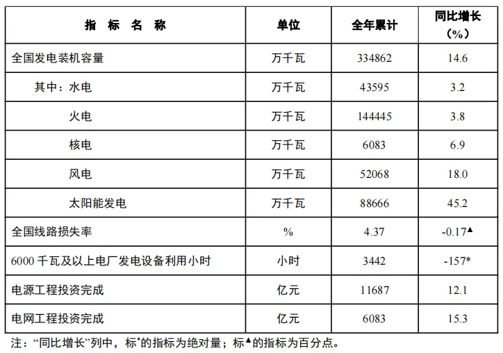 2024年,全国6000千瓦及以上电厂发电设备累计平均利用3442小时,比上年同期减少157小时;全国主要发电企业电源工程完成投资11687亿元,同比增长12.1%;电网工程完成投资6083亿元,同比增长15.3%。