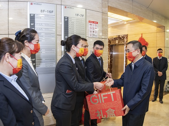 “新年好!大家辛苦了,感谢大家优质出色的服务!”在集团公司总部一楼大厅,邹磊首先向坚守岗位的物业值班人员致以节日的问候并为大家送上慰问礼物,对全体物业人员在过去一年中立足岗位全力做好各项服务保障工作,为集团公司生产经营工作顺利进行所作出的辛勤奉献表示感谢。勉励大家再接再厉,坚守服务品质,创新服务模式,以一流业绩打造一流物业服务品牌。