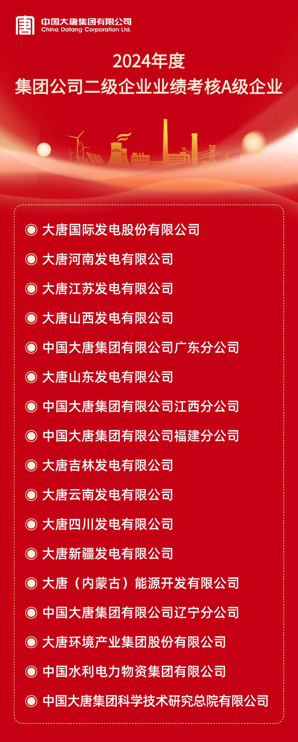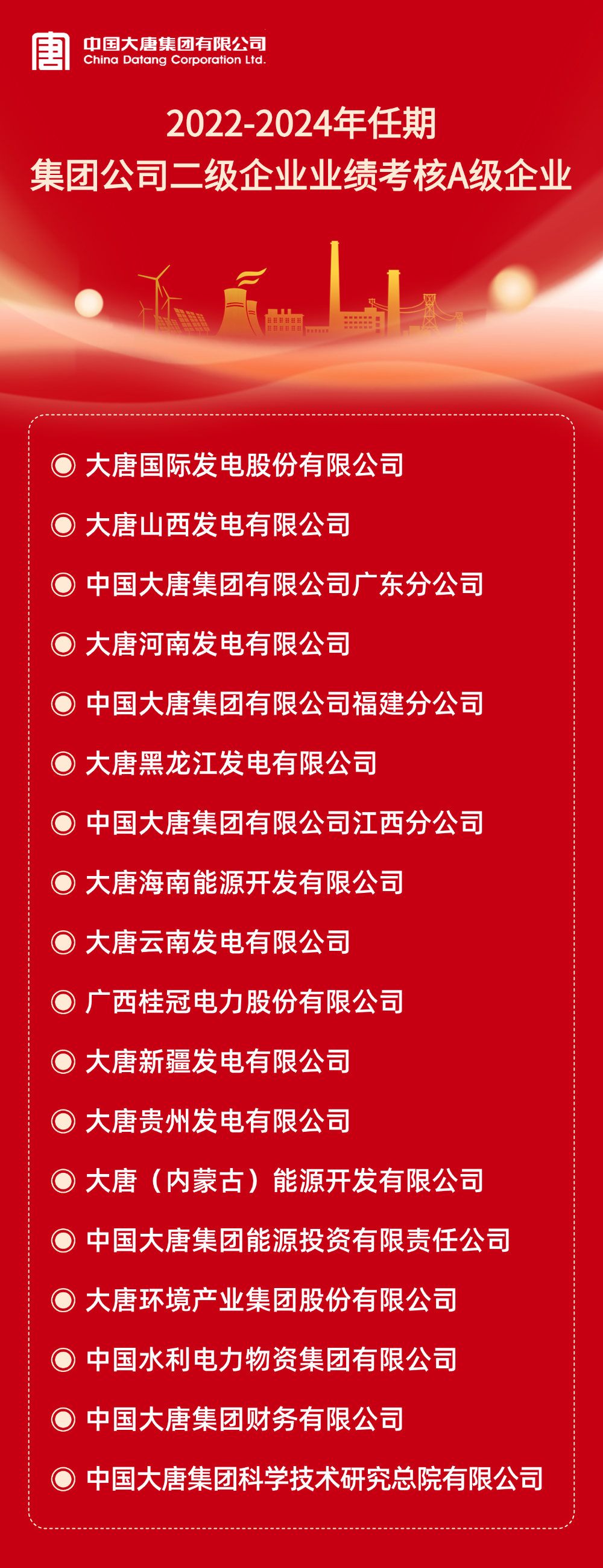 本网讯 根据《中国大唐集团有限公司所属企业年度业绩考核办法》和《中国大唐集团有限公司所属企业任期业绩考核管理办法(试行)》及有关规定,2024年度及2022-2024年任期二级企业业绩考核结果已经集团公司董事长专题会审议通过。A级企业名单如下: