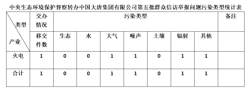 2025年6月7日,中央第七生态环境保护督察组向中国大唐集团有限公司移交第五批群众信访举报件,共计1件,为来电举报,涉及大气问题1个、噪声问题1个、辐射问题1个、其他问题1个。所有举报件办理工作已第一时间进入调查核实办理程序,办理情况将按照相关要求反馈督察组,并及时向社会公开。
