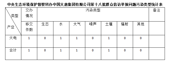 2025年6月27日,中央第七生态环境保护督察组向中国大唐集团有限公司移交第十八批群众信访举报件,共计1件,为来电举报,涉及水问题1个、大气问题1个、土壤问题1个。所有举报件办理工作已第一时间进入调查核实办理程序,办理情况将按照相关要求反馈督察组,并及时向社会公开。