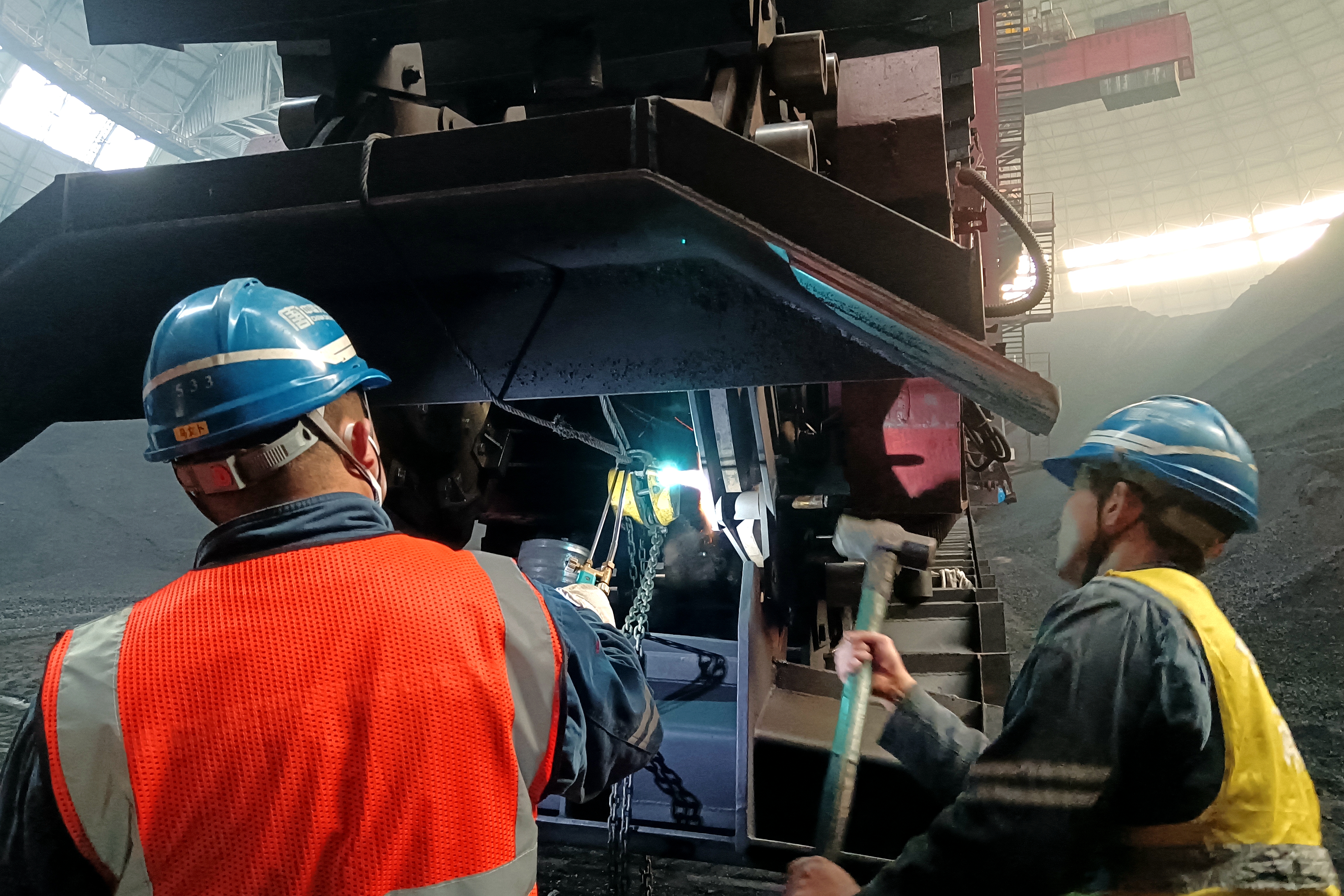 “咚……”圆形煤场传来有节奏的振打声,一锤一锤的敲打声响彻整个煤场,秦岭发电公司承揽富平热电维检工作的项目部输煤检修职工们正在忙碌着。