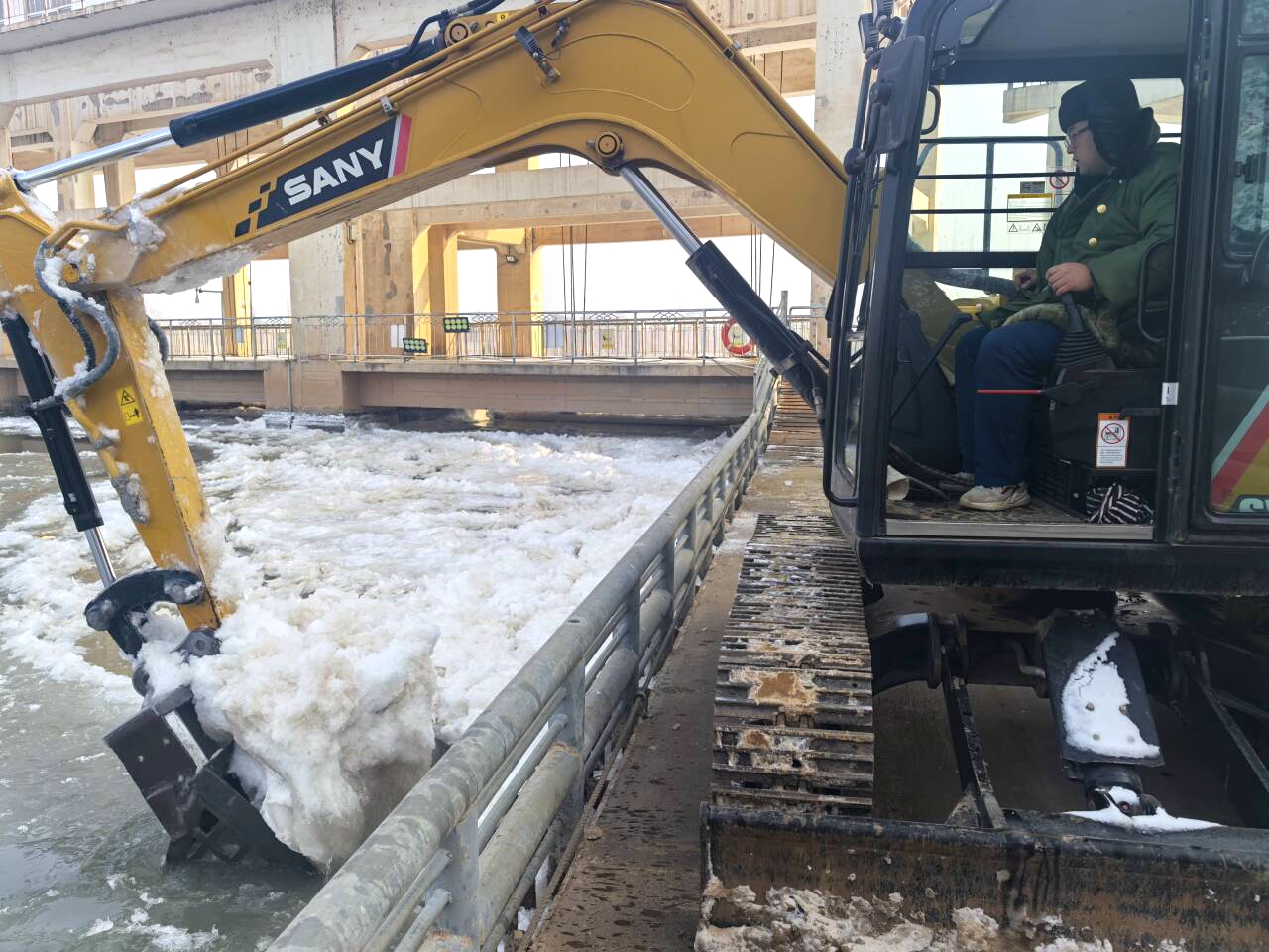 李宁驾驶着除冰机,缓缓靠近拦污栅。机器的轰鸣声在寒冷的空气中回荡。他小心翼翼地操作着,确保每一次的冲击都能精准地击碎冰层,而不会对拦污栅造成损伤。