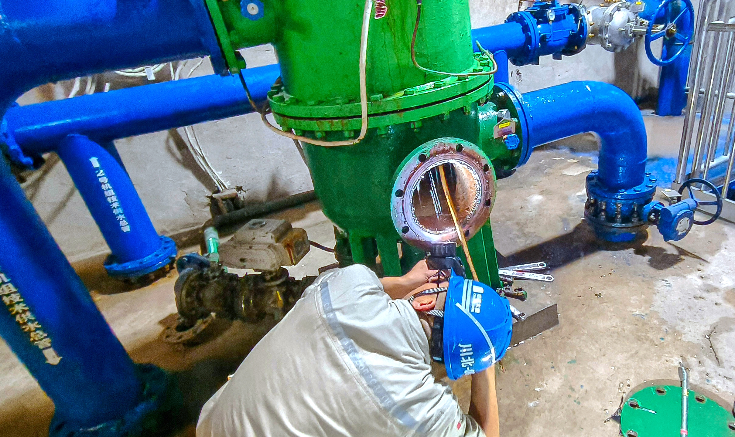 滤水器沉重的顶盖被两人合力打开——眼前的景象令人心头一沉:滤网已被厚厚的泥沙完全糊死,枯枝、塑料袋死死卡在网眼深处,密不透光。