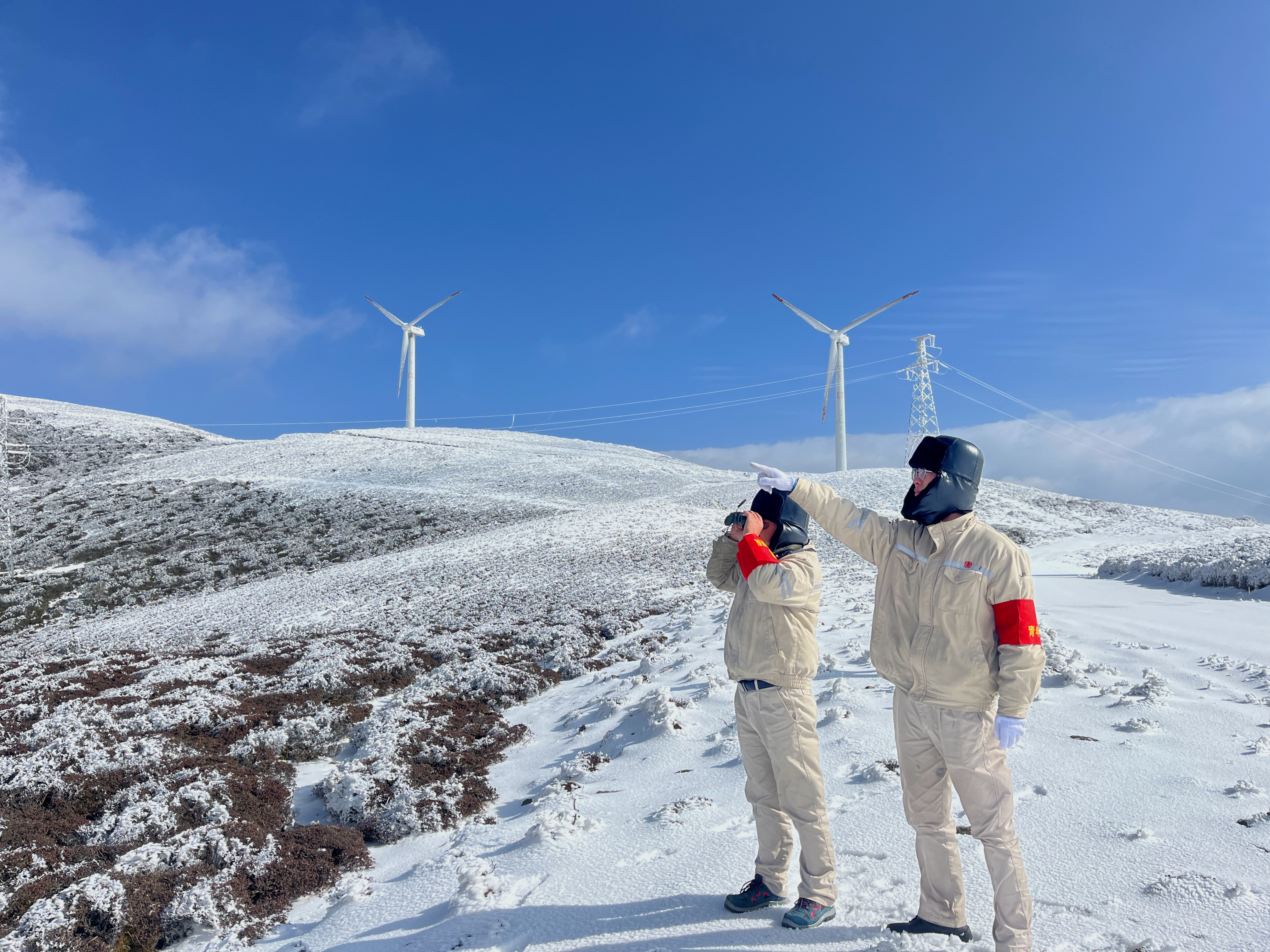 “李师,开慢点。”“李师,停一下,我们看一下覆冰情况。”“李师,停一下……”孙雁钦一路上走走停停,观察叶片、铁塔、线路覆冰情况。
