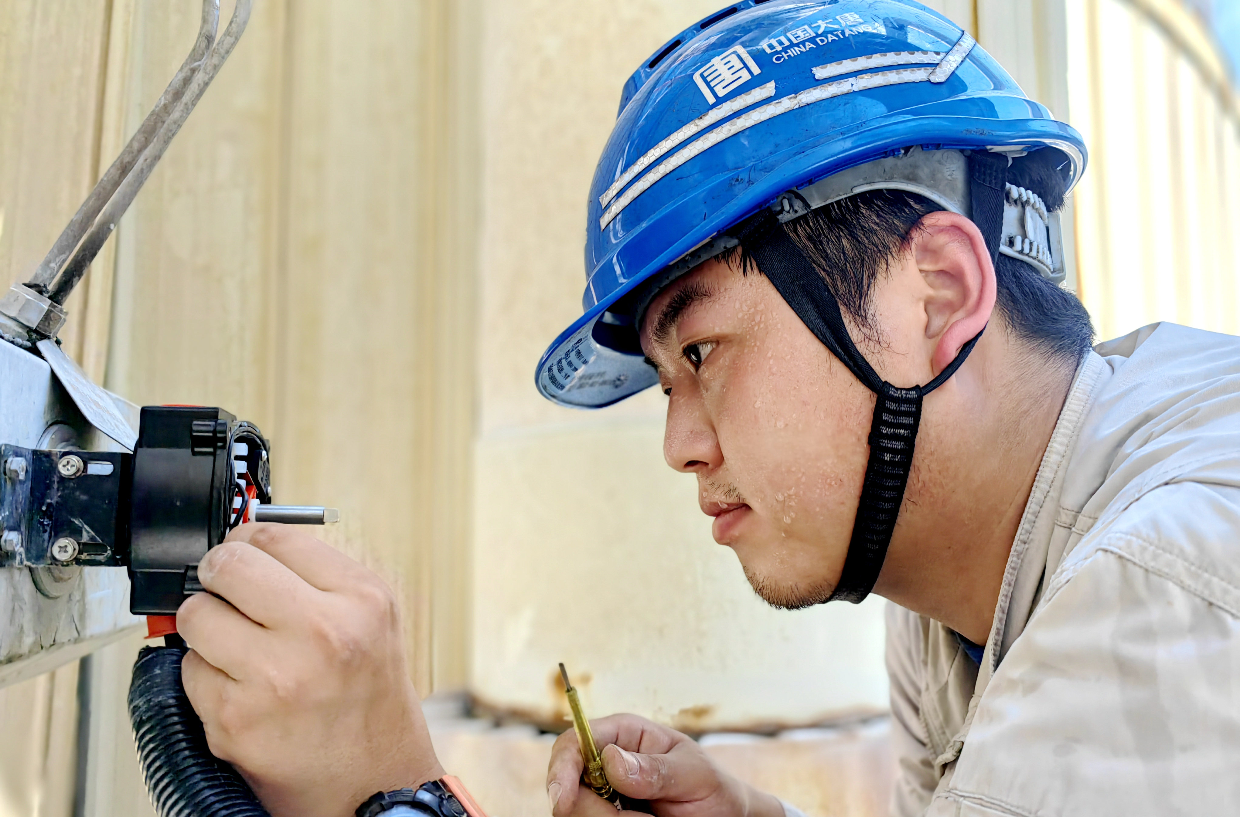 补给水车间大门洞开,一股凝固般的热浪扑面袭来,令人窒息。王娜娜监护工作班成员康耀铎挤进狭小的作业点,发现裂口PU管上的卡箍早已锈死,空间逼仄,吊扳手难以施展。他只能侧身蜷缩,一寸寸艰难地转动扳手,每次不过挪动十几度。