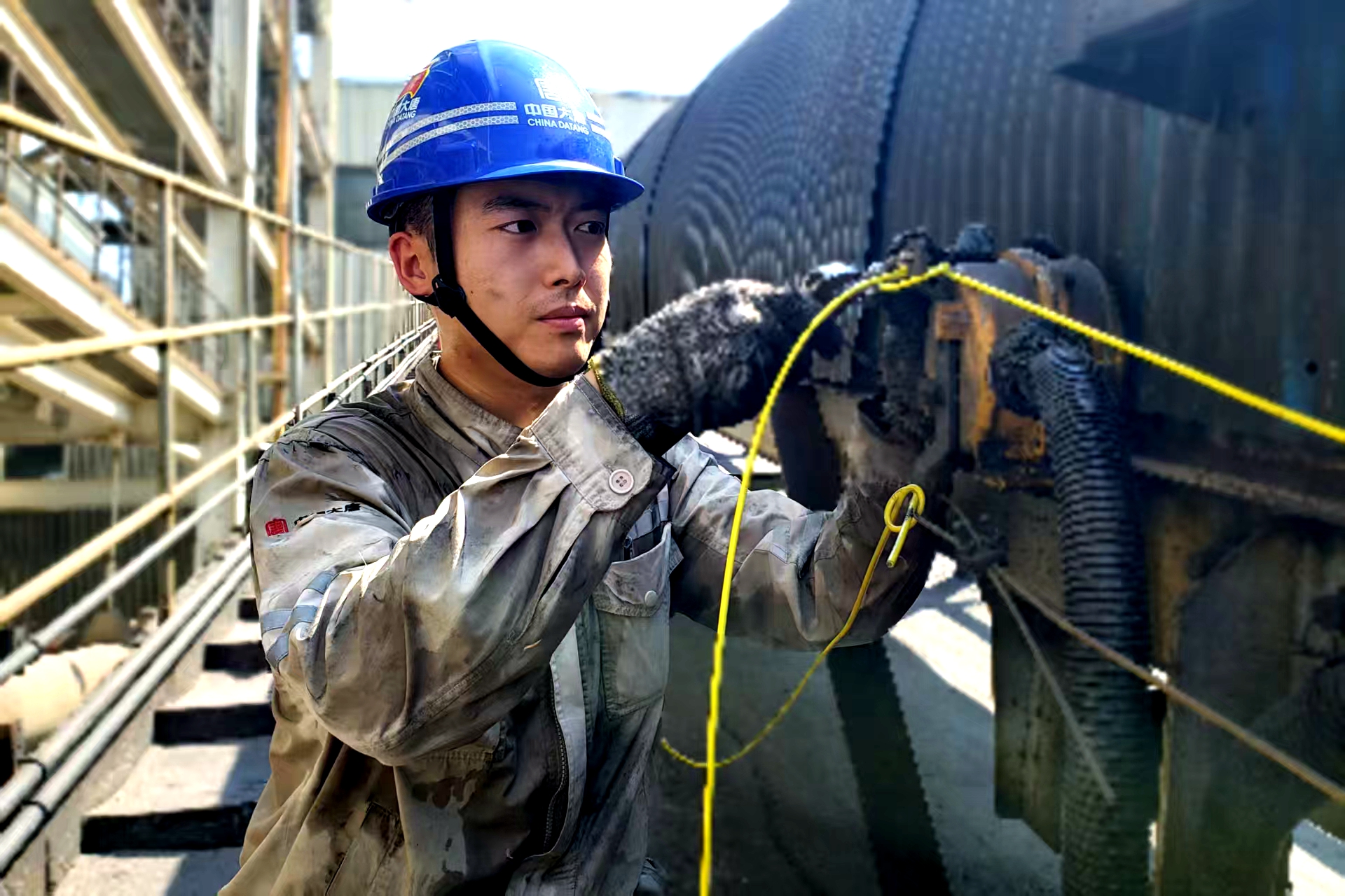 他们熟练地安装上新的拉绳开关,反复核对接线图后将信号线牢固地接到端子上。“递下新拉绳。”随着一声呼喊,未纪牢迅速将新拉绳递上去。他们默契配合,让一卷拉绳舒展身躯沿着皮带机架穿过一个又一个固定环,并且逐一固定到拉绳开关上,确保每个间距的卡扣牢固紧实、拉绳松紧度恰到好处。尽管满脸煤灰、浑身湿透,他们依旧有条不紊地推进着,每个人的眼中都透露出必胜的决心。当最后一道卡扣锁紧时,整条拉绳如琴弦般笔直绷紧。
