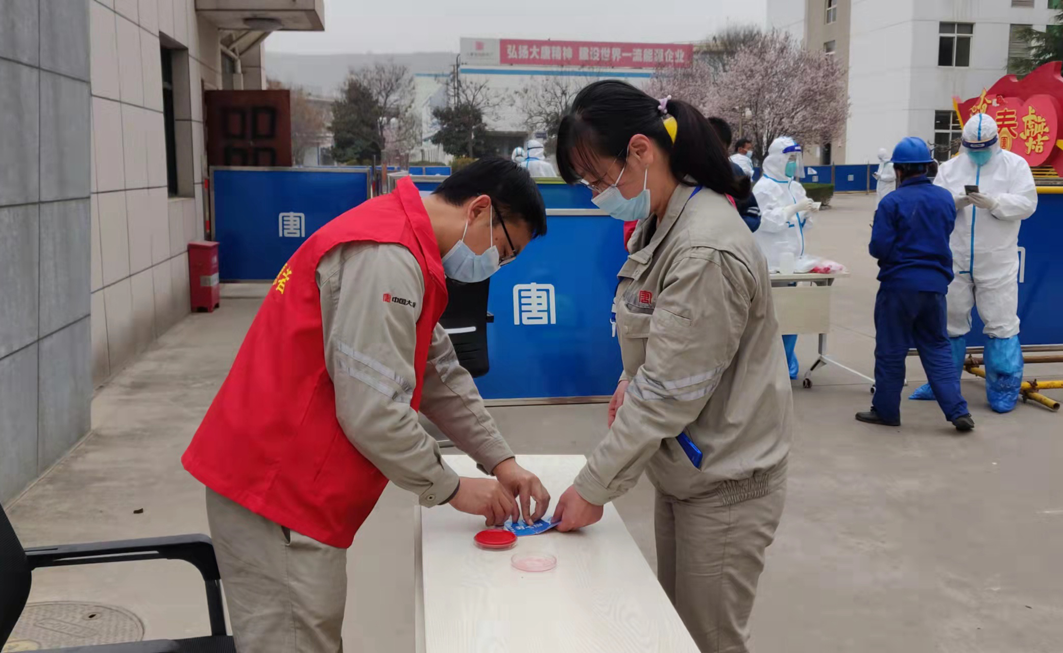 该厂各党、团支部分别成立党员消杀队、青年突击队,对全厂所有会议室、办公室、班组、值班场所、宿舍楼等分片包干、消毒杀菌;9个支部书记、35名党员志愿者主动请缨,承揽了核酸检测及分桌就餐期间的现场引导及厂区隔离人员送餐送水工作等,以实际行动在抗击疫情中擦亮“大唐红•无限能”党建品牌。
